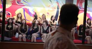 there was a high end club where a bunch of clean looking women sat in a glass